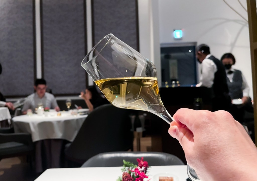 因為反射反而呈現一種水銀一種透明銀雅的感覺,從微微的青澀、淡白色進入酒體而形成金黃談到,我搖晃酒杯,救援俐落滑下,乾淨清澈而帶來舒服柔和感。