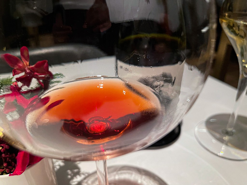再欣賞一下,確實的優雅清淡,一陣透明然後肉色、皮膚、草莓、莓果,乾爽乾燥鹽礦然後有點澀酸的皮感。我搖晃酒杯,酒腿乾淨如軍隊般整齊ㄧ致的滑落,酒體清澈乾淨。