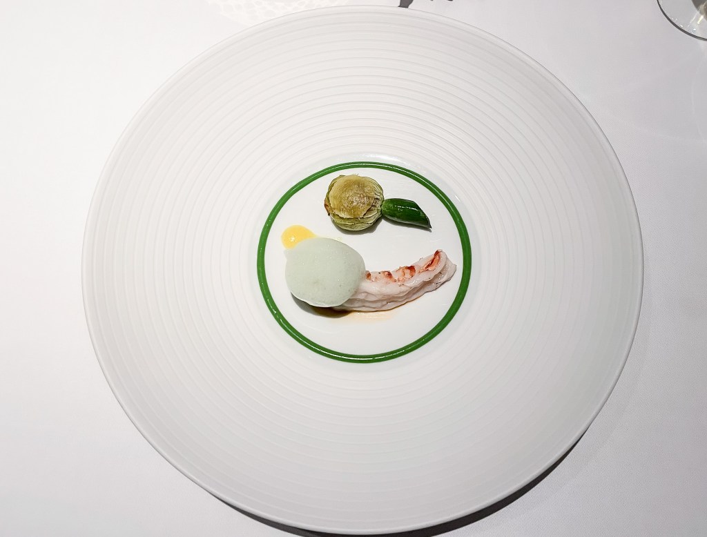 吃這道要有點程序式的儀式感,我用一旁的捏子,夾起軟絲,然後放入小調羹然後再入口。這味道,似乎有點蒟蒻滋味,不知道是不是康普茶還是哈密瓜,使得綜合起來的滋味有點麵粉味感,但軟絲這樣處理我認為相當有創意。搭配白葡萄酒,帶出葡萄酒本身十分乾爽曠野的大地清爽,因此酸澀度強化了起來,後味則柔順了。
