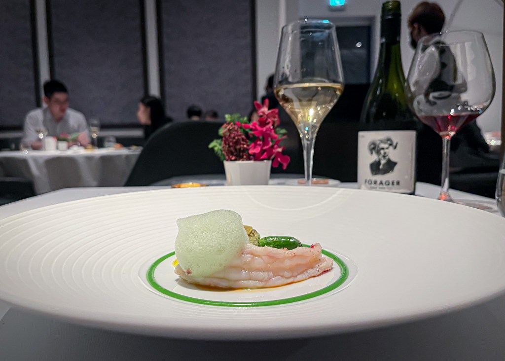 好的,來到第五道前盤料理Entrée「櫛瓜、鳳梨、南洋綠泡泡、櫛瓜花」(Pan-fried prawn Zucchini, Pineapple, Nanyang green foam, Zucchini Flower)。