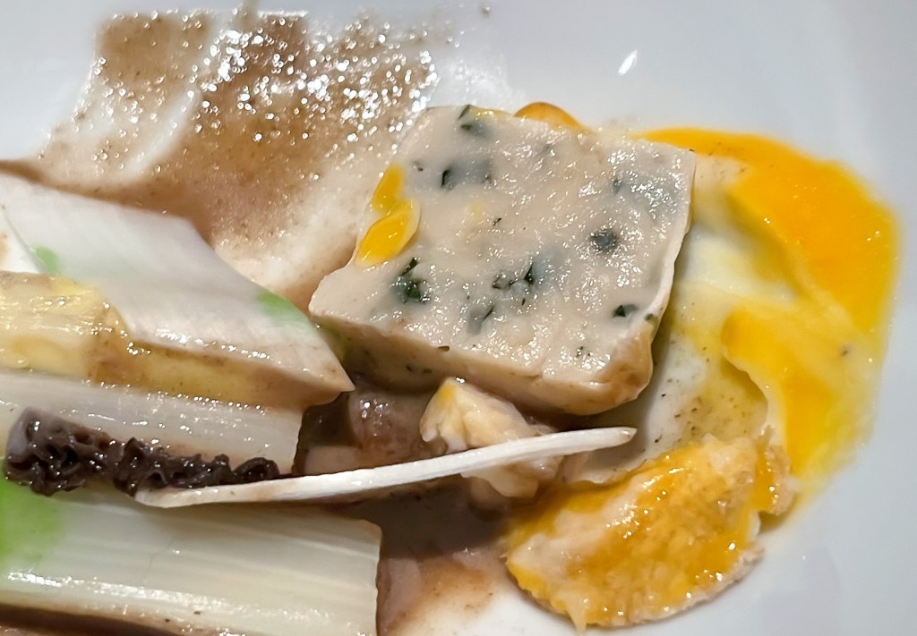 今天的第六道菜是「薩索雞–龍蒿慕斯、白蘆筍、青蘆筍醬、黃酒羊肚菌醬汁」(Sasso chicken mousse-Tarragon mousse, White asparagus, Green asparagus sauce, Yellow)。