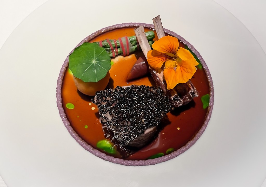 第七道是主餐Main course「烤小羔羊背–茄子泥、綠蘆筍、芝麻脆片、薄荷油、金蓮葉、羊肉餡餅、羔羊汁」(Longan wood grilled lamb chop/ Eggplant purée / Sesame crisps)。