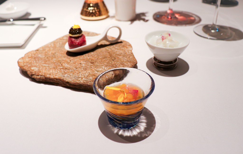 第二道是趣味小食 Amuse-bouche「鴨肝蒸蛋、甜酒、米舒芙蕾」(Duck liver steamed egg, Sweet wine, Riz soufflé)。