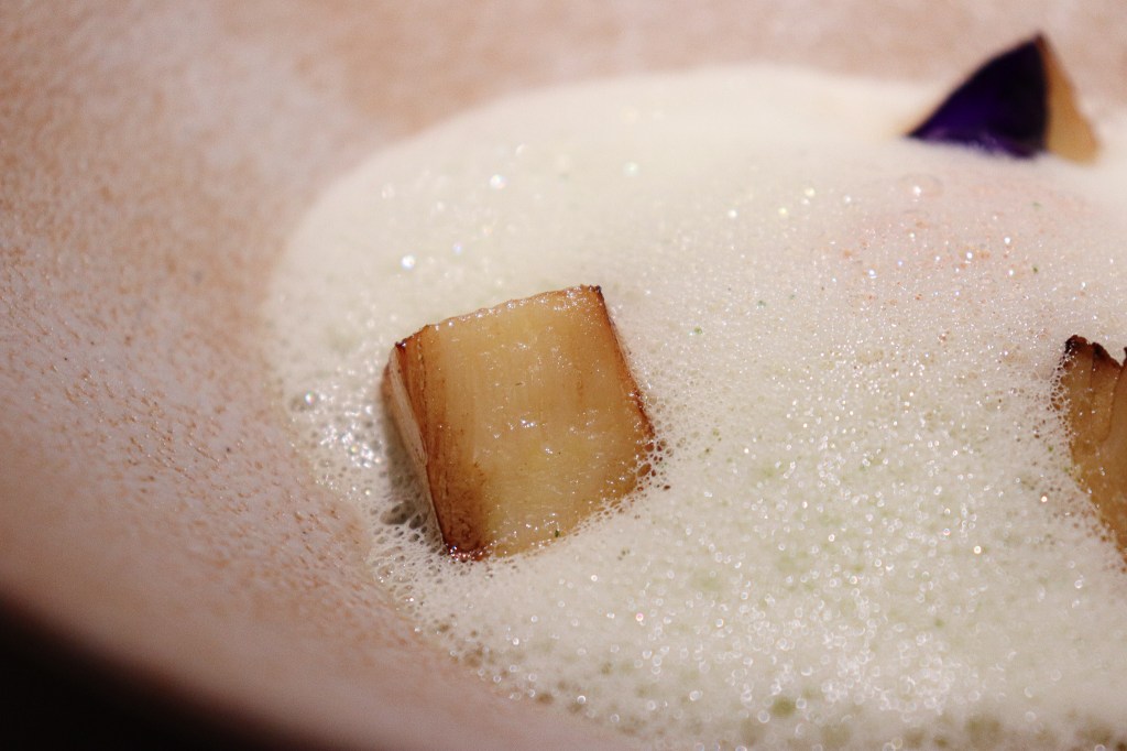 當竹筍、青醬泡沫、溫泉蛋與蛋白還有牛肝菌一起配上,天啊,真美味,像是湯品項式料理。搭配白葡萄酒,依然完美可口帶著甘醇的曠野感。