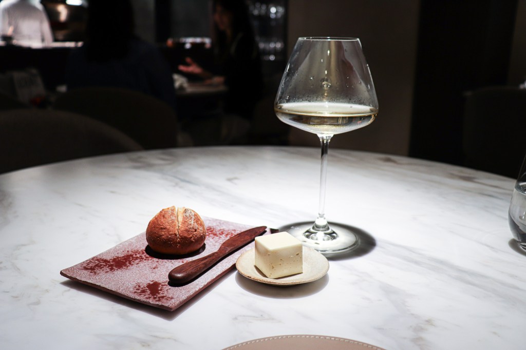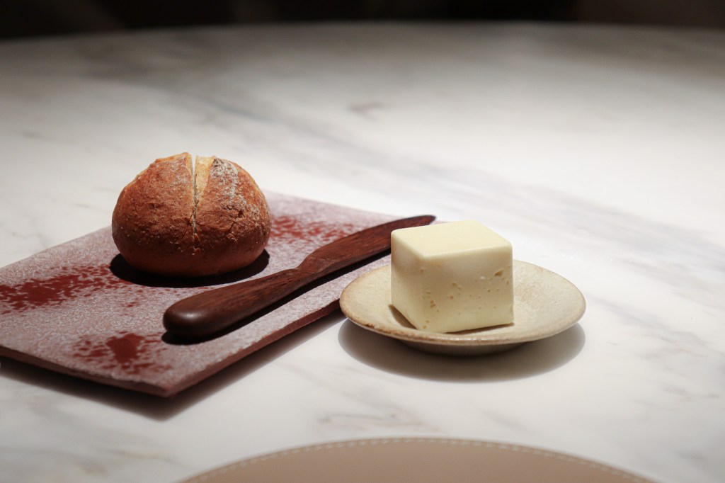 有趣了,服務人員先上一塊後十方塊狀的豆漿奶油,而後送上今天第二款麵包,這是「圓麵包搭配自製無糖豆漿奶油含海鹽」。
