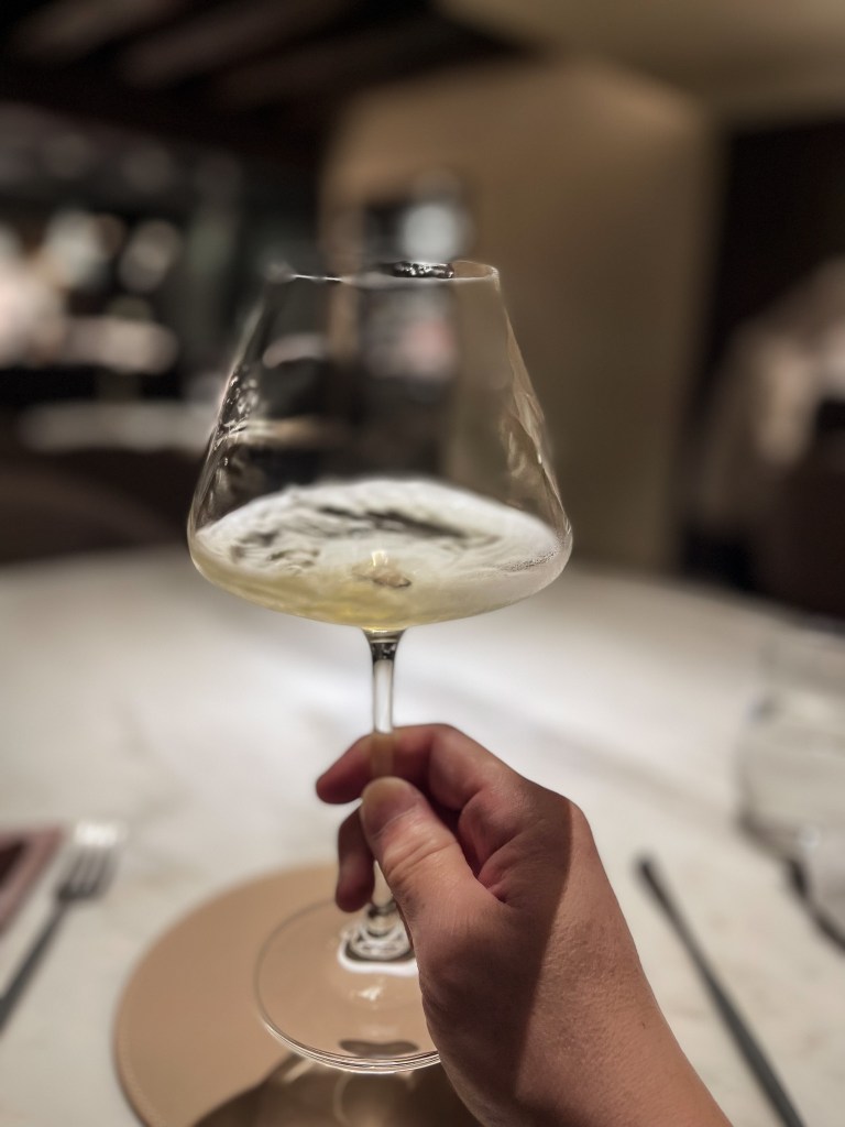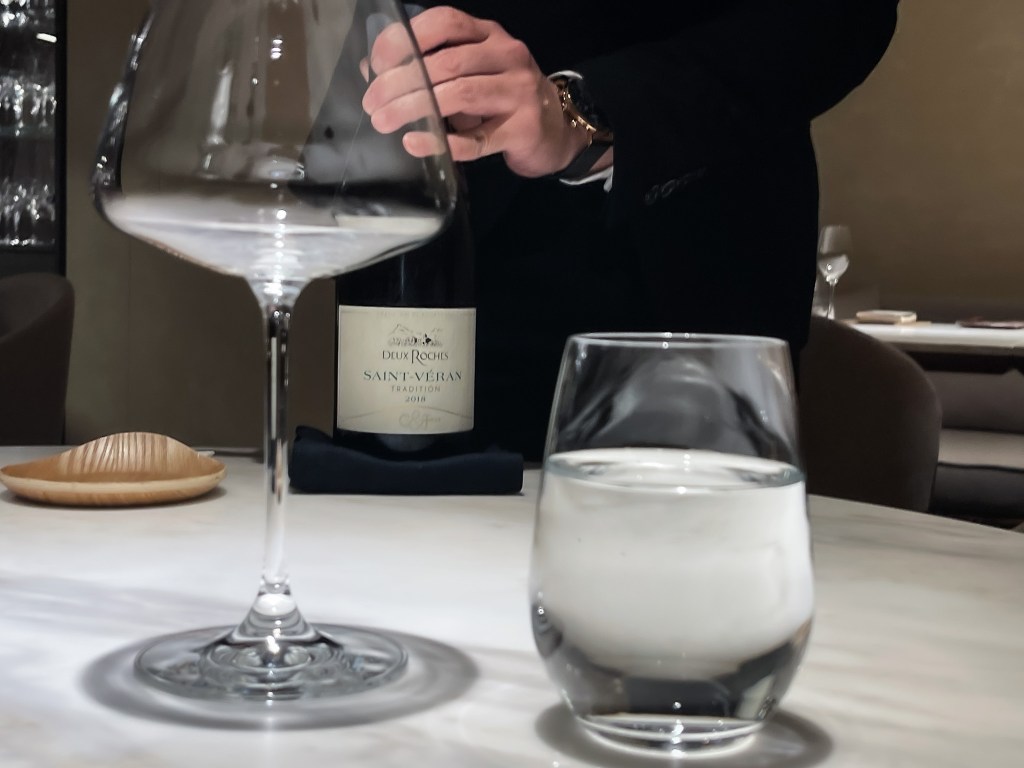 好的,經過餐廳的侍酒師開瓶試酒後,並將這款布根地白葡萄酒注入適宜的布根地葡萄酒杯中,隨後便先開始品味這款葡萄酒的滋味。