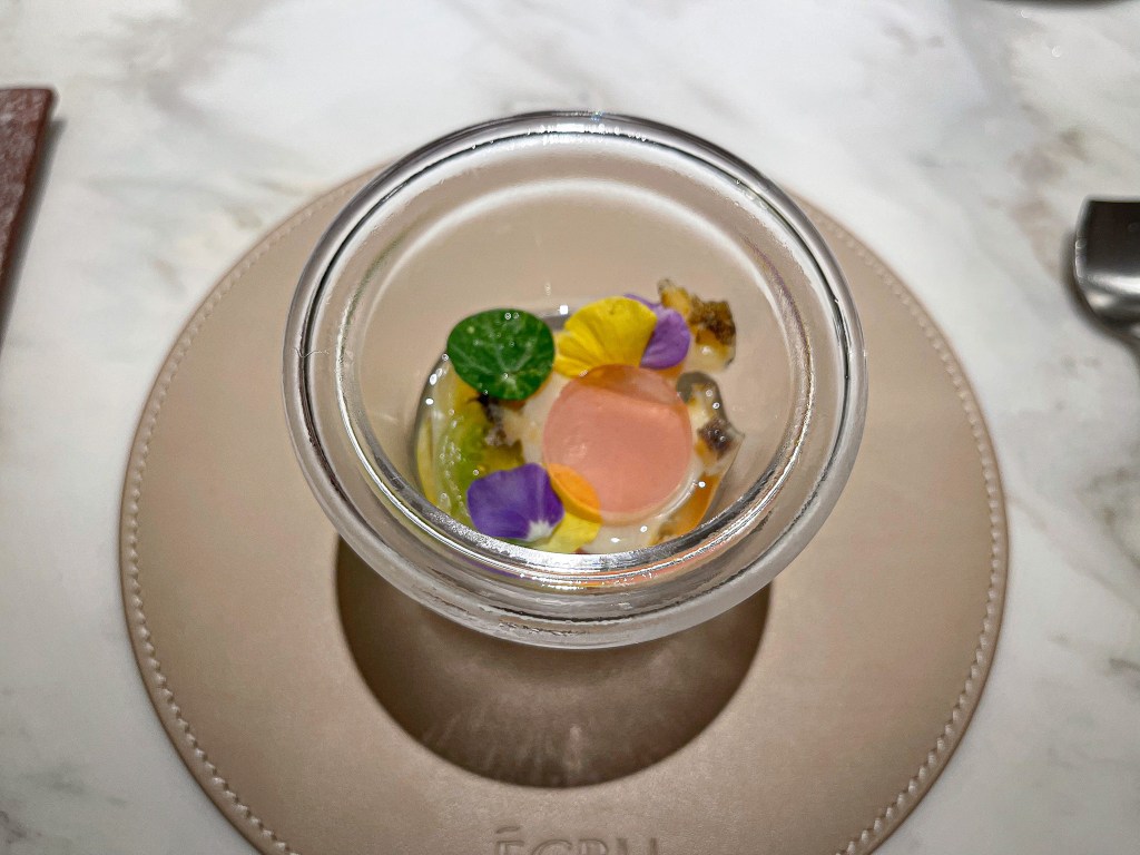 第一道點心確實十分春天,三色番茄、櫻花凍還有鮑魚片,很嫩很舒服,果香味清爽四溢,番茄對啊,番茄總帶來萬象更新的滋味,尤其這道料理是開胃,不太酸但相當清新。