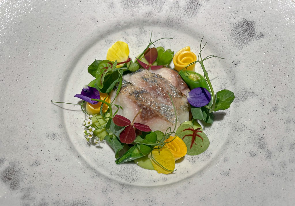 好的,到目前為止的料理都讓我感受舒服溫柔感,接著第四道料理上桌,這款是「九州真鯛、玉米筍、綠蘆筍」(Snapper Of Kyushu, Corn Shoots, Asparagus)。