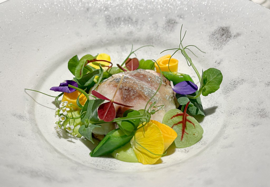 這道是經過烘烤的竹莢魚,襯底有黑橄欖、千層酥、還有青色味道均勻的醬料,周圍搭配許多季節蔬菜,無論是小黃瓜花、碗豆、酢漿草、紅,等等,直接以刀切下,聽到脆聲,沒脆就是千層酥。