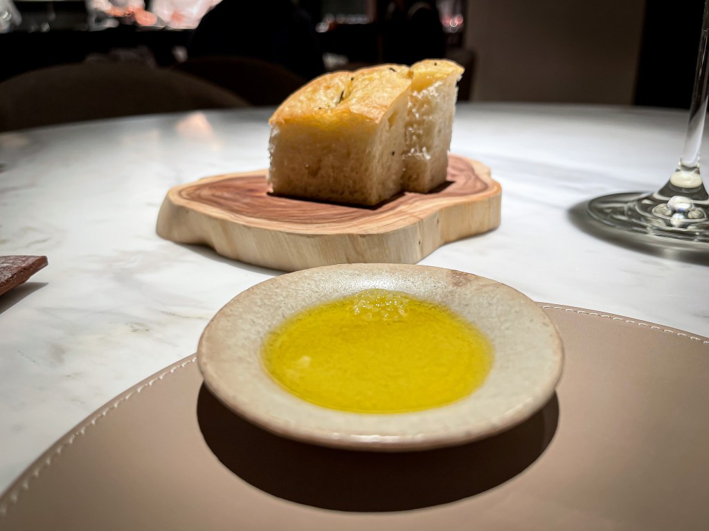 搭配白葡萄酒,勻稱光滑細緻,有如水梨果汁。很舒服。我將麵包搭配橄欖油多著一種番茄果味,不是油膩而是醇厚感,再喝一口白葡萄酒表現出一種勻稱美好味,尤其果香果味存在,帶出一種吧..水果沙拉的清新。當佛卡夏沾入海鹽以及橄欖油,鮮鹹更果為。