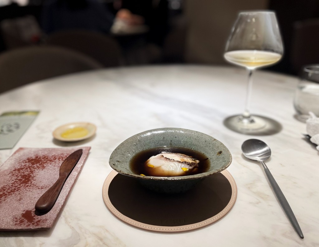 我先嚐湯頭,牛肝菌魚骨汁甘醇舒適還有點橙汁味,搭配白葡萄酒清新果香風味優雅。當切下真調肉柔嫩美味,沒有鮮腥,搭配白葡萄酒酒又是一陣果香可口。