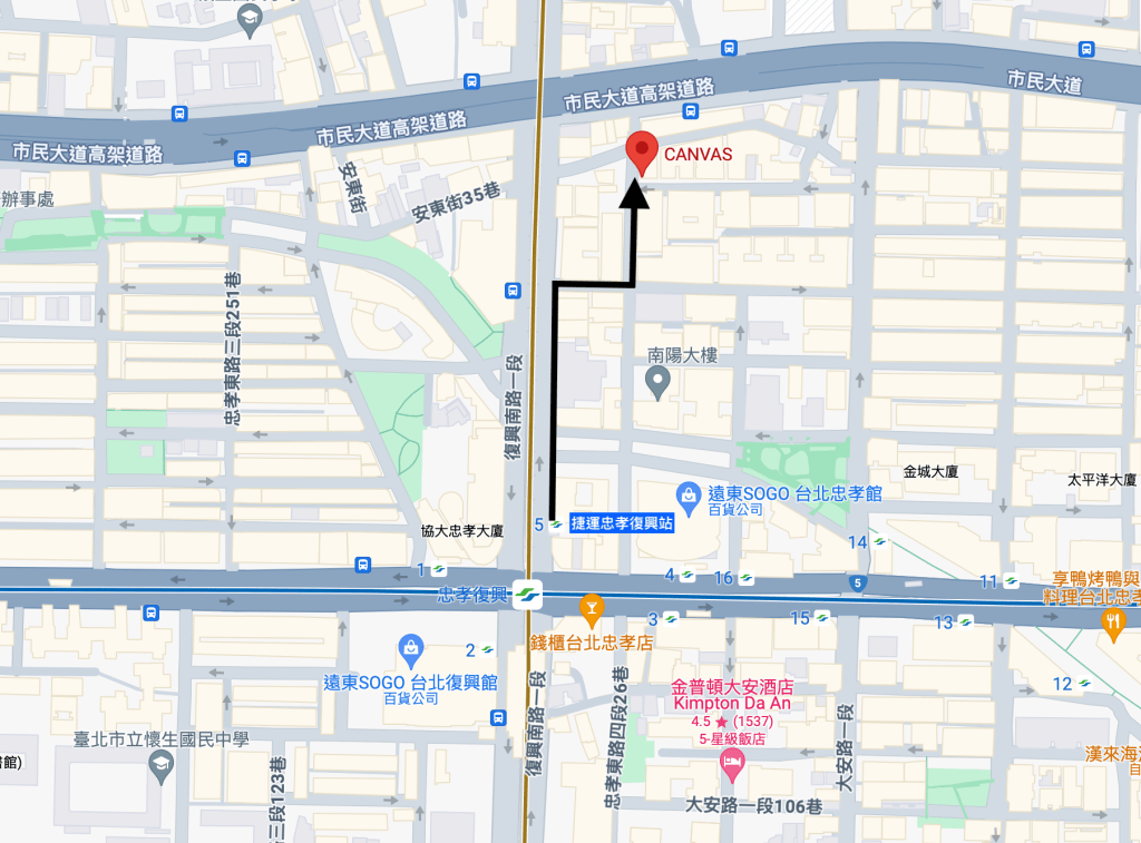 從捷運板南線忠孝復興站(BL15, Zhongxiao Fuxing)→CANVAS(25.02N, 121.32E)。