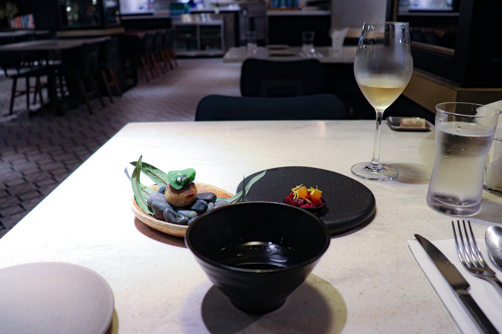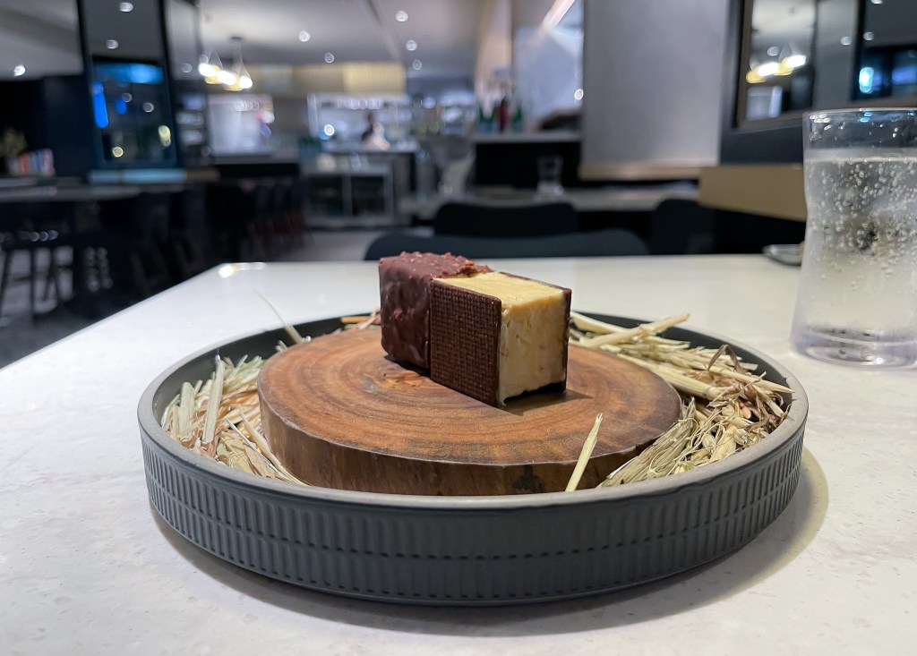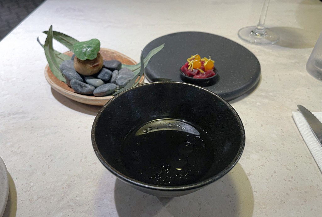 袋鼠肉地瓜球有點巧克力,但吃下我很喜歡這滋味,也很有意思第一口口感像地瓜球,又有點餡餅感,肉絲細緻,尤其是上層的著料粉襯托辛香,這也好吃開胃。