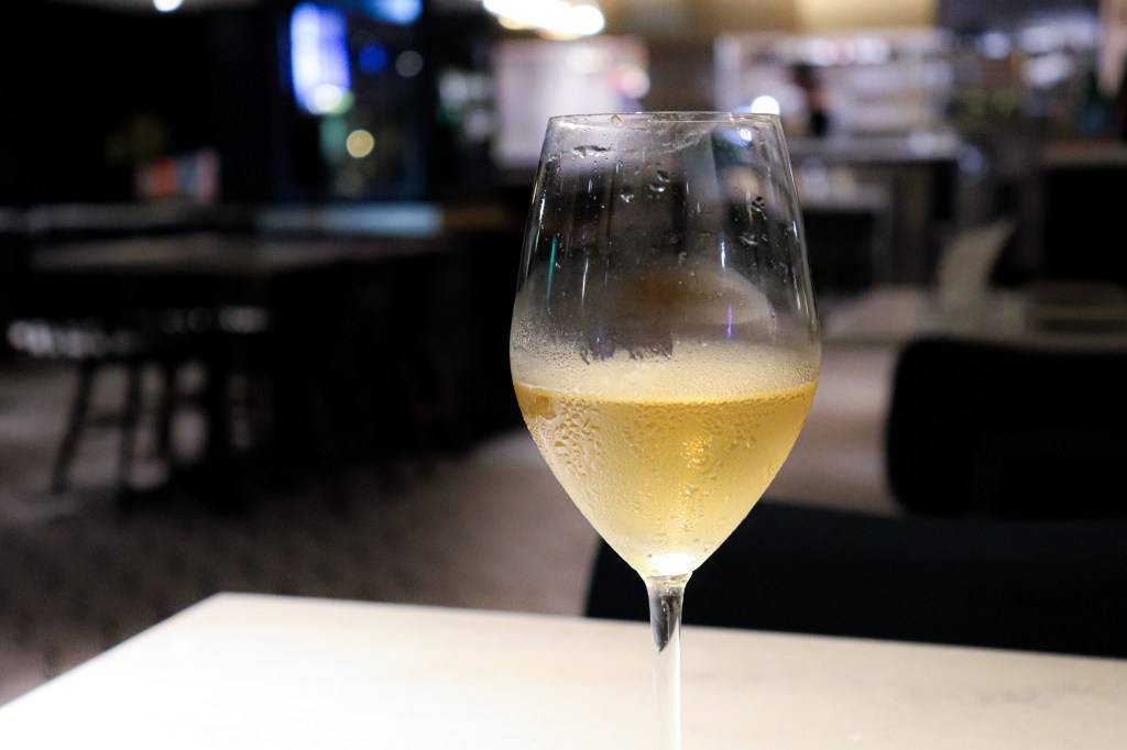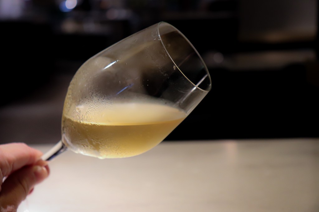 色調上,在優雅的燈光下呈現輕盈的青黃、微微到鳳梨水果黃,然後進入金黃色,事實上是有點美洲橙的果肉色,但是在這白酒杯中與燈光下卻呈現一種優雅的黃色光澤。