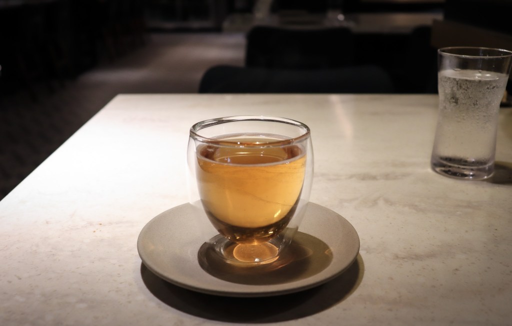 洋蔥湯,在暗黑色的碗裡比較不能感受色澤,但溫熱帶著一點胡椒、與肉汁香氣,但湯頭不錯好喝,事實上是一款辨識度不高的湯,但是就像肉骨茶一樣,有其風格,但這道湯我喜歡。