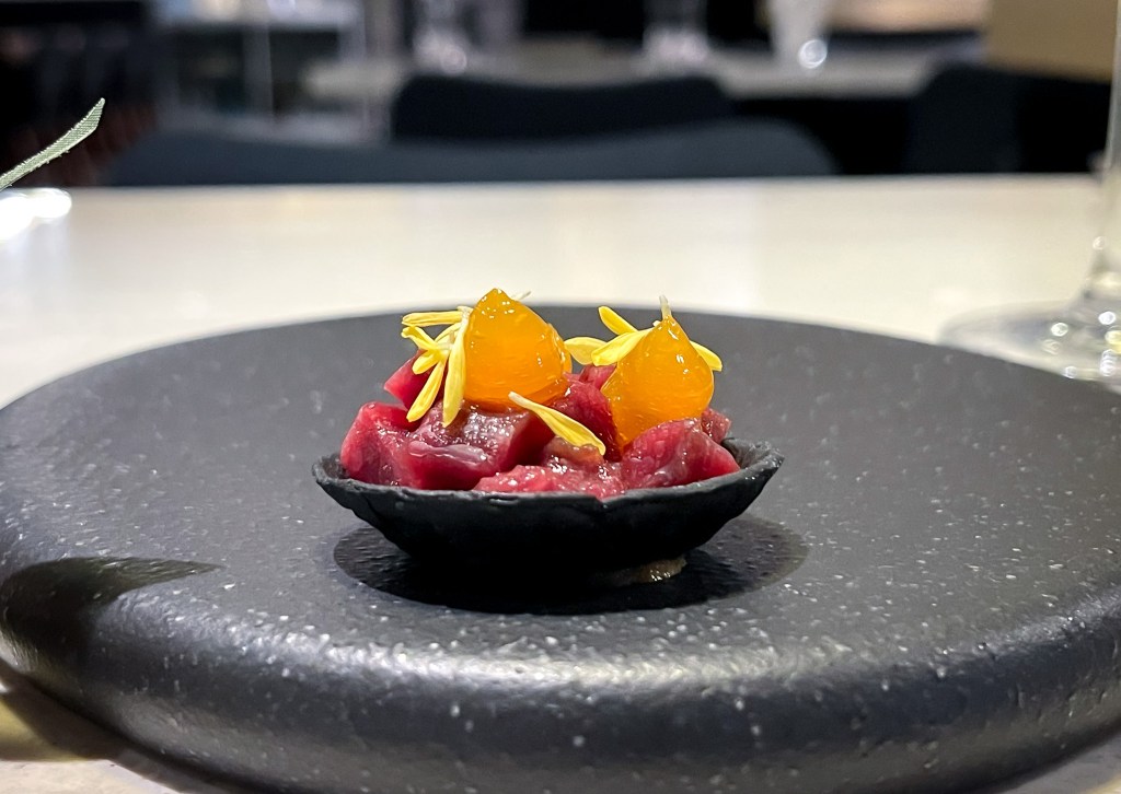 袋鼠肉塔塔,塔皮是脆硬的但那肉塊看似生肉吃下也有那麼點感覺,整體滋味生感卻非常清新,調味也恰好。