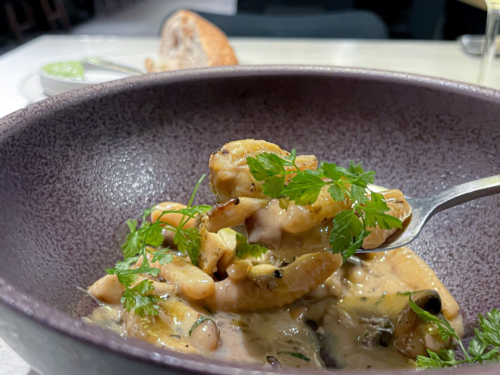 搭配橘酒似乎仍感到紮實乾澀,有大地鹽礦味。我依照建議取一些麵包沾這濃稠的醬汁吃下,是的,這個建議很好,很美味,脆硬的皮,清晰麥香的麵包味,滋味美味好吃。搭配橘酒再次產生酸澀乾爽的礦物岩石感,酸澀就是如檸檬的澀酸,刺激單純卻很自在舒適。