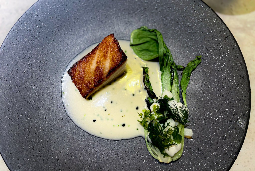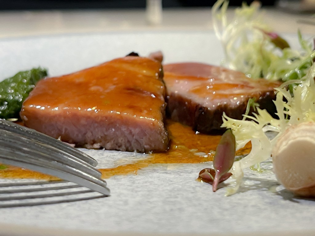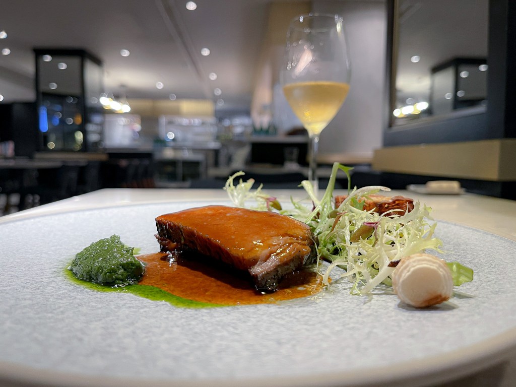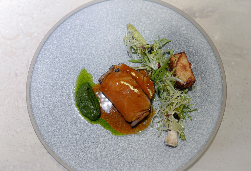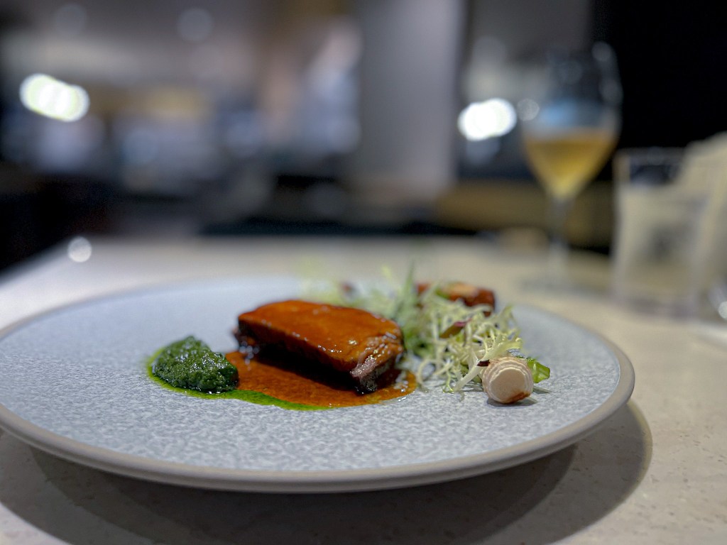 這道是主餐了,主餐是牛肉,是一種澳洲混種牛,但這一款是美國牛混澳洲而引進,所以真的很紮實很脆,單又沒有如牛舌那樣脆,有千層的馬鈴薯,有烤青蒜,豐富而鮮美。搭配一旁的有點飄渺但是滑順的如青醬奶油也都相當可口。