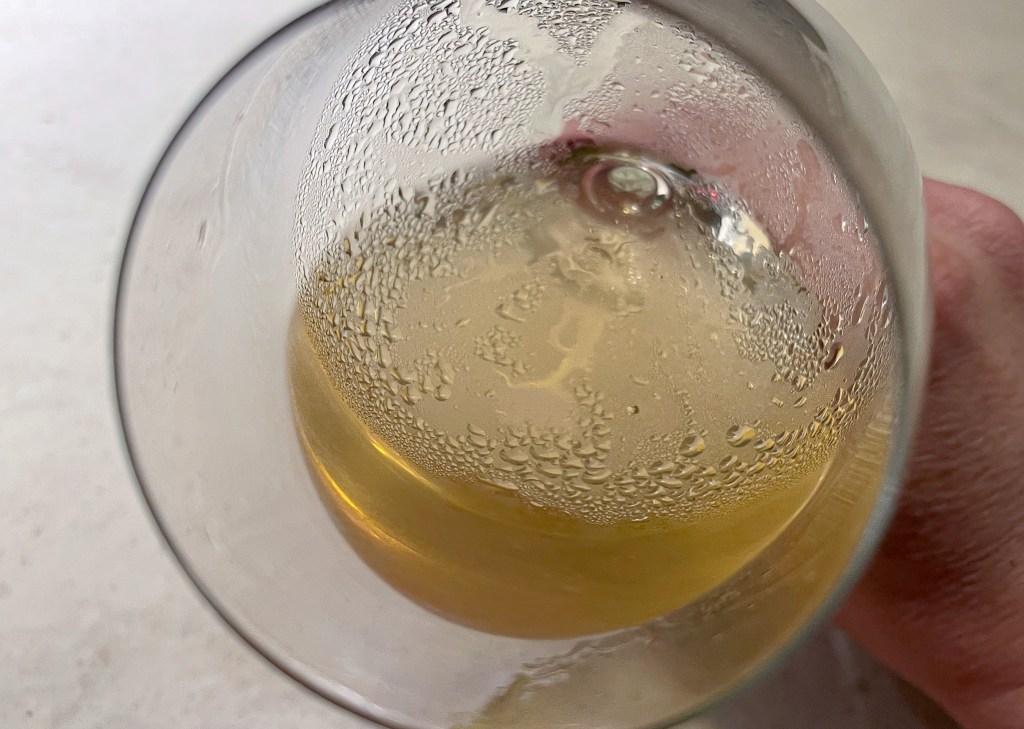是的,它總是那麼的酸澀,酸中帶著礦物、海鹽的感受。也有風乾橘子味,因此中味表現出白葡萄酒的紮實厚味,它是乾爽,有岩礦的,有海鹽的,一種澀感水果的果汁。