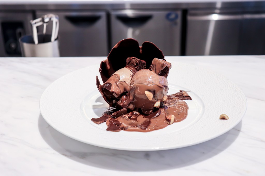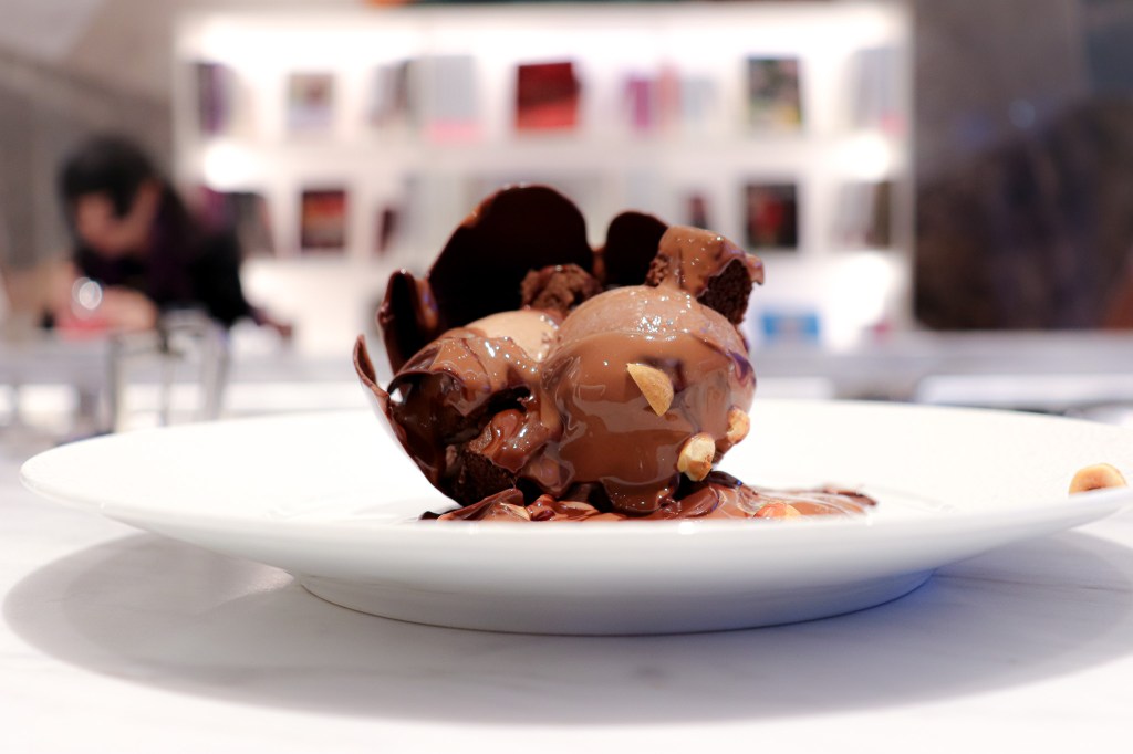 甜美可愛的甜點師,沈穩的,優雅的,不疾不徐的,取出每一項食材,並依照製作甜點的程序進行。她在半球形的苦巧克力之中先放出食材,有巧克力風味餅乾、有榛果風味奶油、有阿拉瓜尼巧克力甘納許蒙特(ganache monte),還有巧克力冰淇淋、最後再將立一半苦巧克力球體闔上。