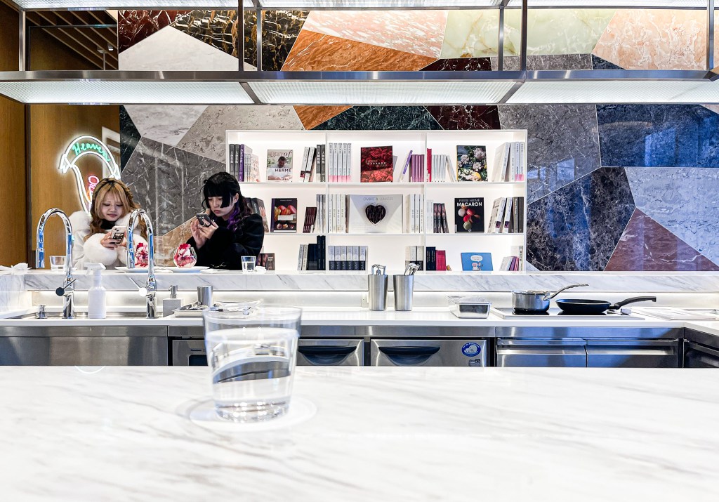 2樓的空間,除了中島吧台外,在窗邊以及另一區塊有共享的,開放式的,如家庭聚會般的座位空間。此外,在空間內的書架上排列許多有關PIERRE HERMÉ食譜和藝術書籍,將此營造成PIERRE HERMÉ的書房一樣放鬆悠閒。