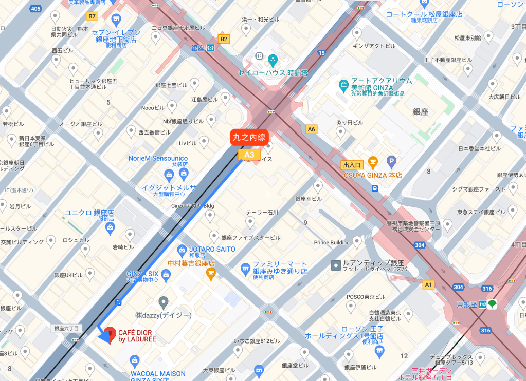 從山手線東京站(JY01,Tokyo)→東京地下鐵丸之內線東京站(M17, Tokyo)→東京地下鐵丸之內線銀座站(G16,Ginza)→CAFÉ DIOR BY LADURÉE(35.40 N, 139.45E)。