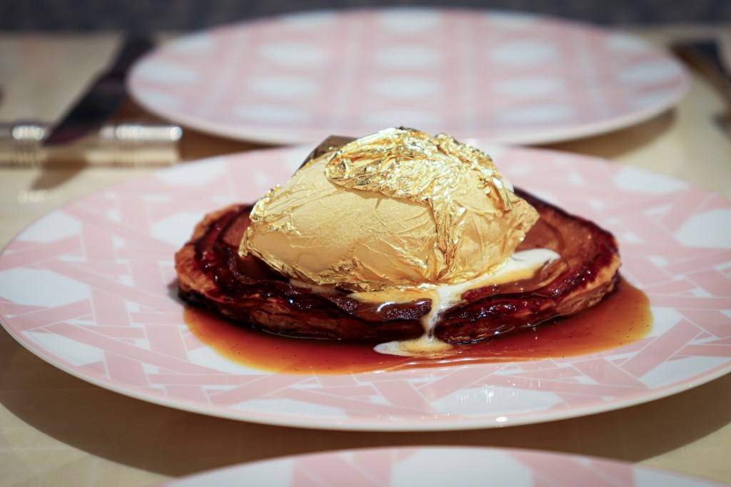「TARTE FINE AUX POMMES」(Apple tart, vanilla ice cream, caramel sauce, gold leaf)。