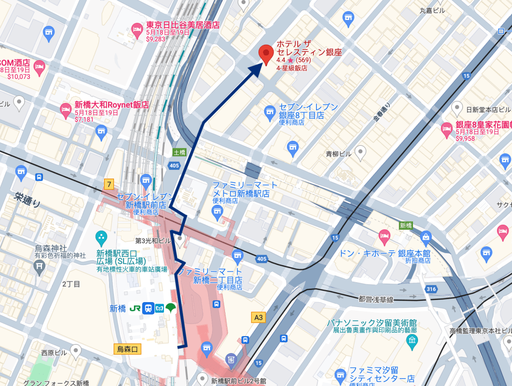JR山手線新橋站(JY29,Shimbashi)→THE CELESTINE HOTEL GINZA(35.40 N, 139.45 E)。