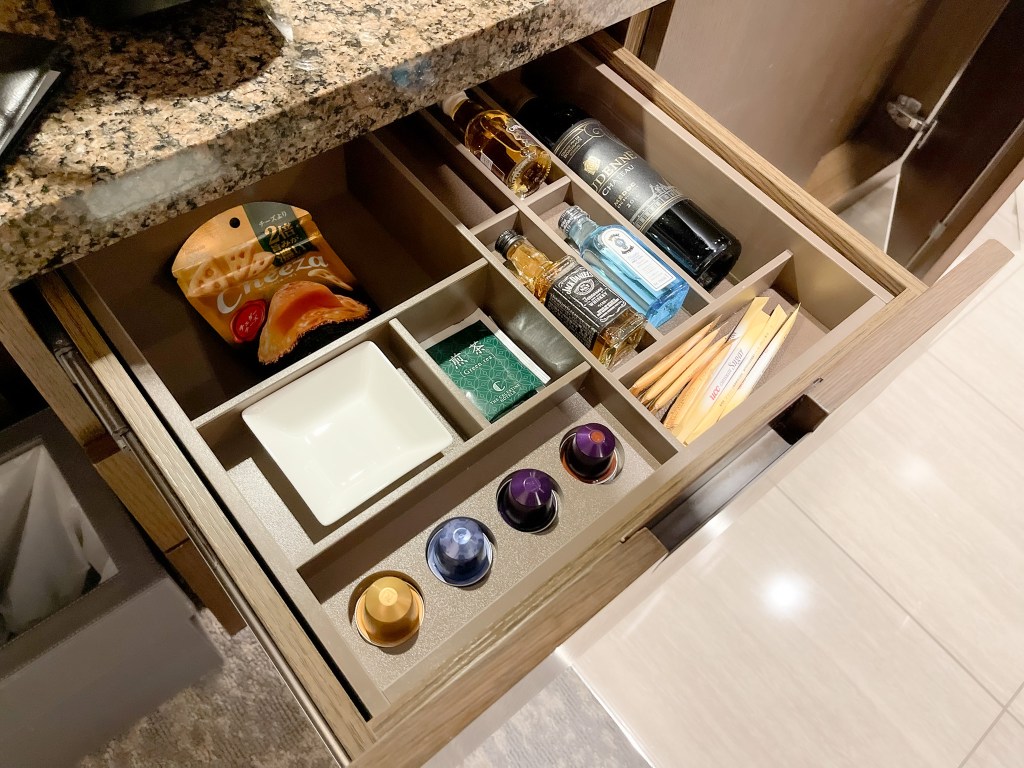 在前方也就是相對床鋪位置的是系統書桌櫃子,這包含冰箱以及抽屜裡所有的茶杯用具以及提供的茶水、紅茶、礦泉水與咖啡膠囊,至於mini bar的東西是額外收費這裡不贅述。
