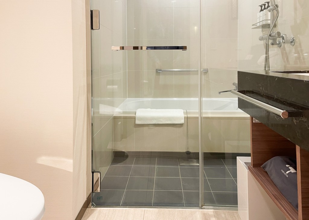 而左邊則是浴室廁所,且是有浴缸的,只不過淋浴與浴缸事隔在一起的。而浴廁裡擁有的基本配備,除了牙刷牙膏組外,還有棉花棒組等,以及毛巾、沐浴巾、洗髮、護髮、沐浴露,刮鬍泡以及洗臉部洗手液以及護膚用品,還一種小型加濕器還。