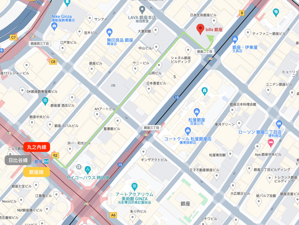 今天在哪兒早餐呢?當然是安排與住所不遠之處,也是在銀座裡。看看,一切都是在安排之內,這一圈皇居其實並未跑晚,除了雨勢漸大外,所幸直接把終點設在櫻田門,直接下地下鐵有樂町線,直接搭往銀座一丁目,然後走到目的地BILLS GINZA,一切完美的銜接。