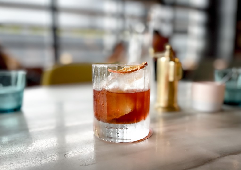 頭看一下在吧檯的工作人員,用了不可少的Campari,還有琴酒以及香艾酒等等攪拌調製,最後附上了一片乾橙皮,不過最讓我心喜的是,冰塊,儘管只是一間早餐,但對於冰塊選擇十分細緻,也不容易快速融化,那麼來嘗試一口吧。