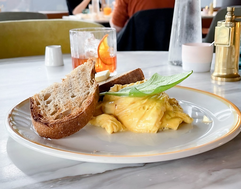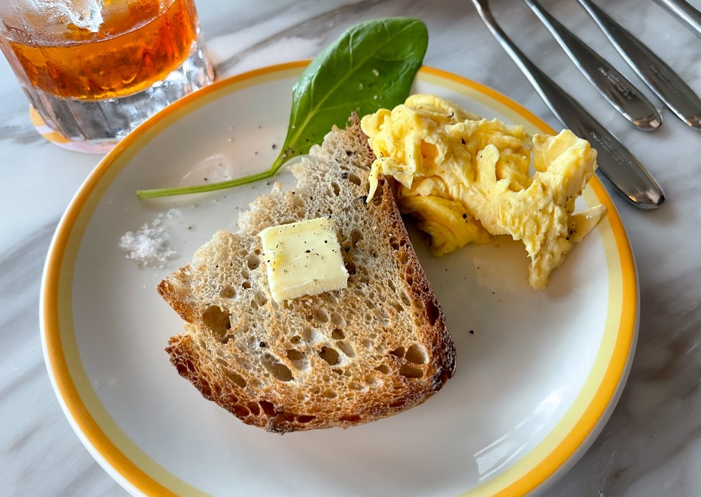 兩片烤的香爽的純麥麵包搭配一塊奶油,搭配小小兵黃的絲滑炒蛋,有如一片包膜包覆一樣,還有一片Basil,以及隨興的黑胡椒以及海鹽等等,簡單輕鬆自在,不會太飽恰好滿足一種氛圍。