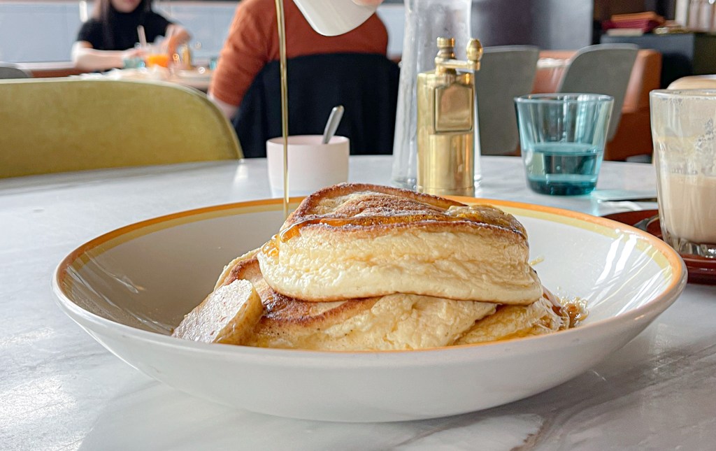 接下來這道似乎是必點,也是招牌的RICOTTA HOTCAKES。這道煎餅或稱他為鬆餅也好,外型看起來就讓我有種鬆軟的放鬆的感覺了,所以也能稱為FLUFFY RICOTTA PANCAKES。