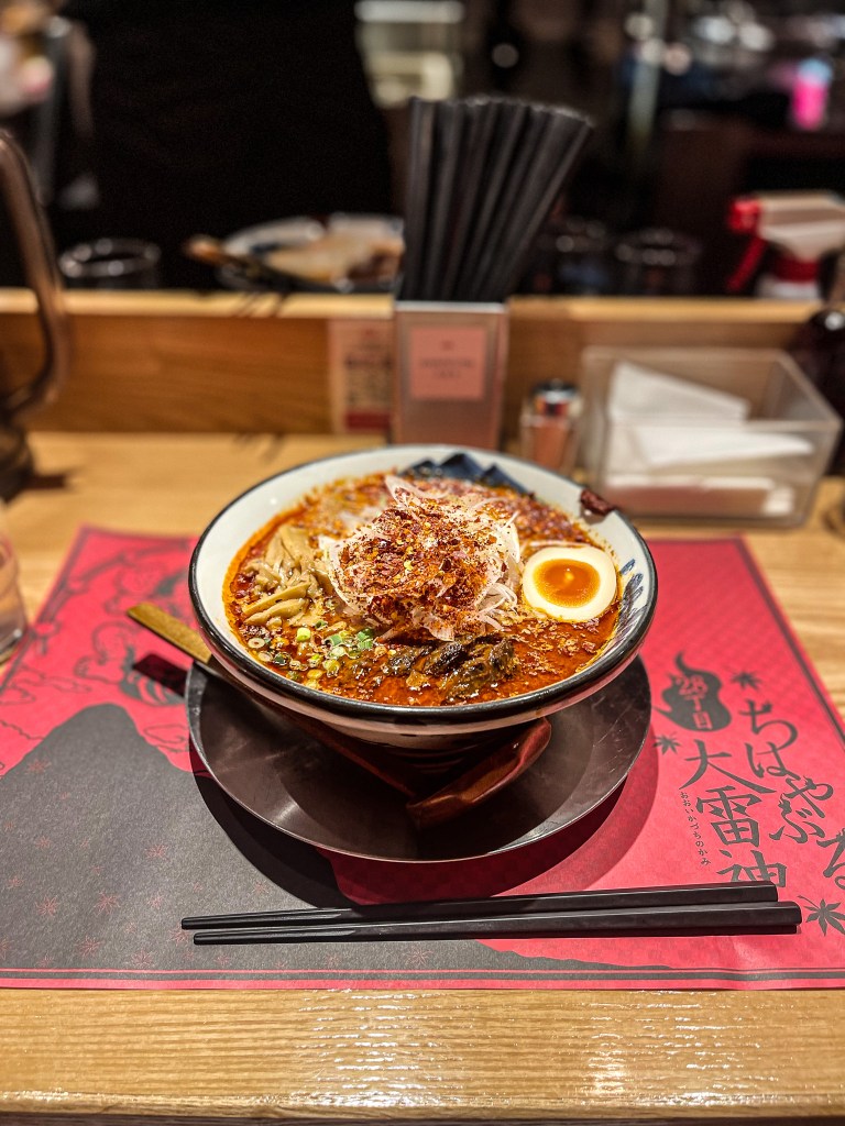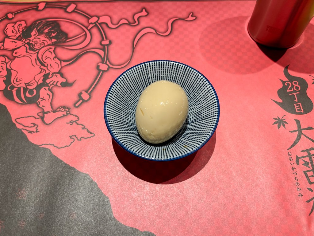 此時,他幫我舖上一塊不一樣的餐紙,一塊紅色的餐墊紙,上面寫著大雷神!!此時我感受到不妙的氛圍,接著送上了小菜,以及多點的溏心蛋,然後再送上這款28丁目大雷神拉麵。