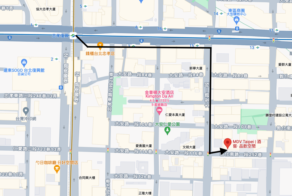 從臺北捷運板南線忠孝復興站(BL15, Zhongxiao Fuxing)→MDV TAIPEI(25.02N, 121.32E)。