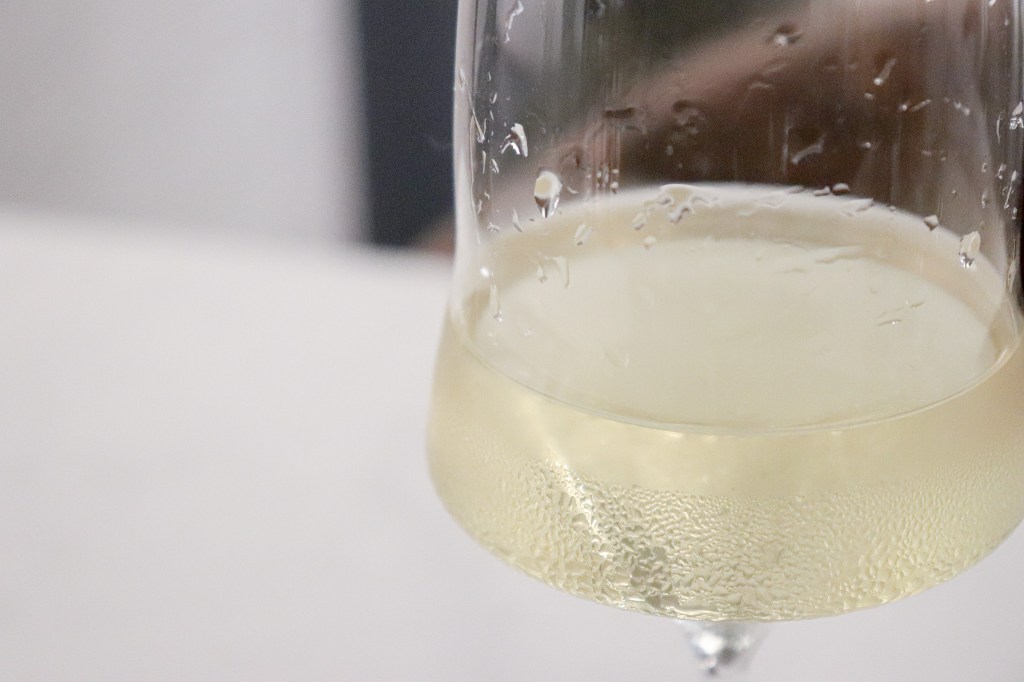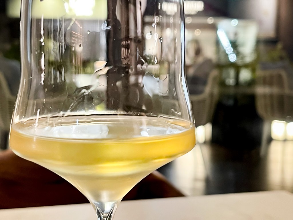 在後味表現,當酒液逐漸退卻之後,那種健素糖味、藥粉味先輕微的展現出,隨著酒液逐漸乾去後,呈現鳳梨、黃檸檬、海鹽、濕潤的石頭、還有檸檬草味,整體來說,我直覺是一種很簡單、簡約感,且直接的表現水果與風土的風味。