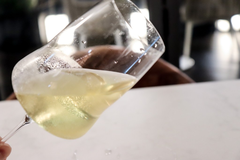 我搖晃酒杯,酒水順暢光澤並隨著杯腹晃蕩,然後酒腿順著酒杯形狀而是大片滑落,如此我才能觀察細緻流下的酒腿。