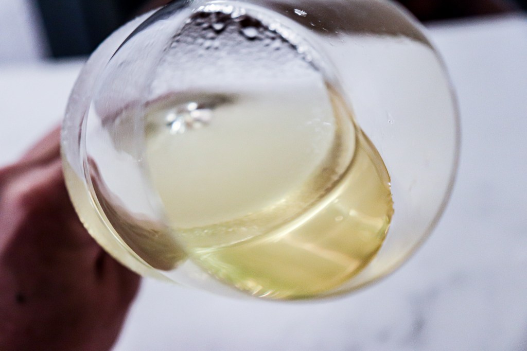 那麼開始品飲它,我飲下一口,滋味光澤而滑順,前味我不感受到酸澀與果感,反而比較像水、像果肉沈澱的水梨果汁,然後逐漸出現了酸澀的檸檬汁感,還有點鹹感,有點像鹽水,比較刺激;也有點岩石味、大地味,反而在果味表現部分比較不那麼清楚。