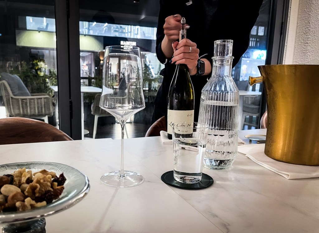 除此之外,也有搭配葡萄酒的餐點可以食用,不過今天的味覺只想好好的喝一隻冰涼的白葡萄酒。因此,在看著酒窖展示的葡萄酒款中,對到了這支酒標簡單且起偉著意的布根地葡萄酒。