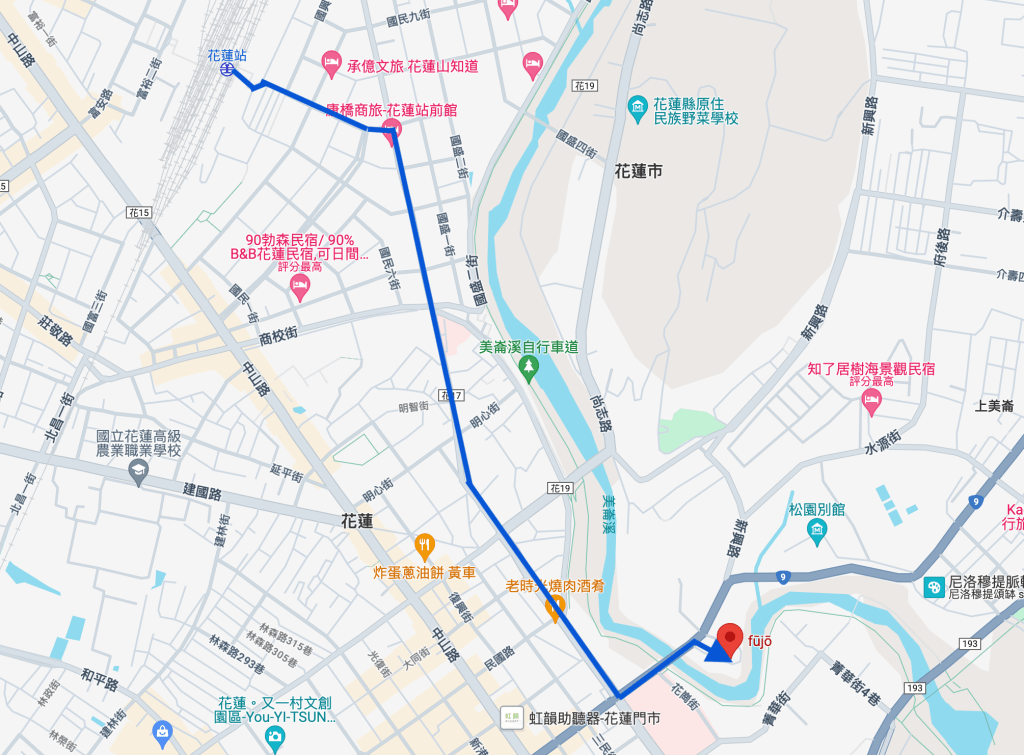 從花蓮火車站(23.59 N,121.36E)→fūjō(23.58N, 121.36E)。