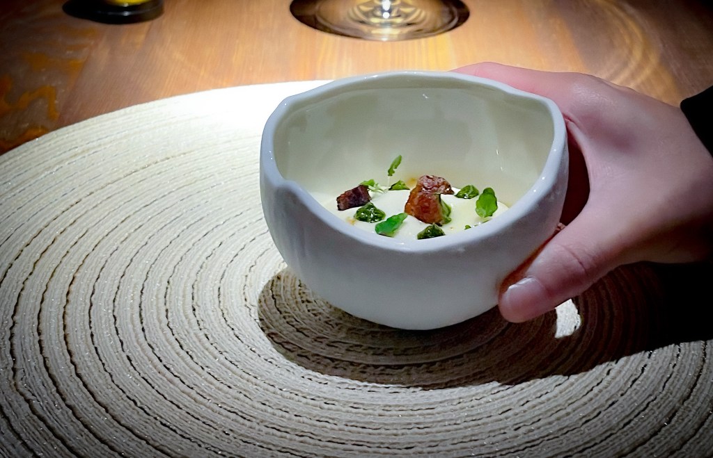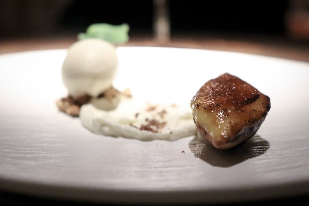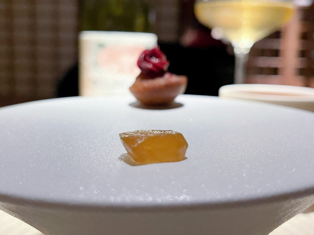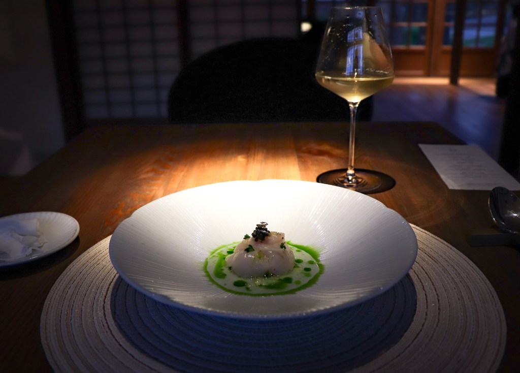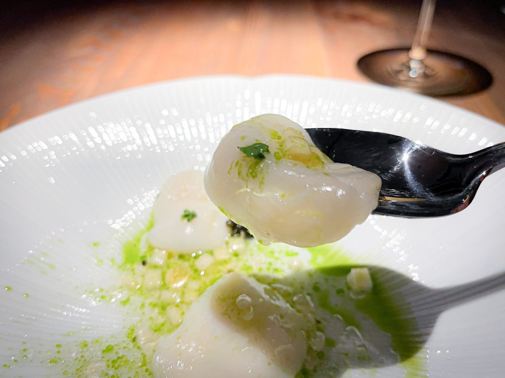我在思考這款酒的黃酒味應該是風土關係吧,或許醒一下會有不同的感受。好的,第一道菜登場了,是「北海道生食千貝、蘋果醋乳清、昆布油」(Hokkaido scallops, Apple Cider Vinegar Whey | Kombu oil)。