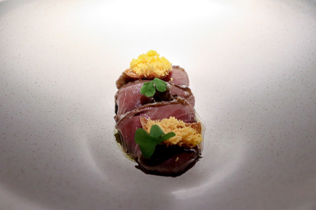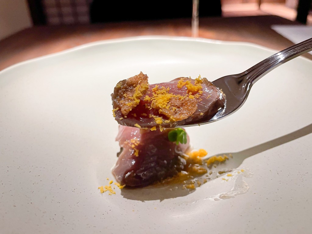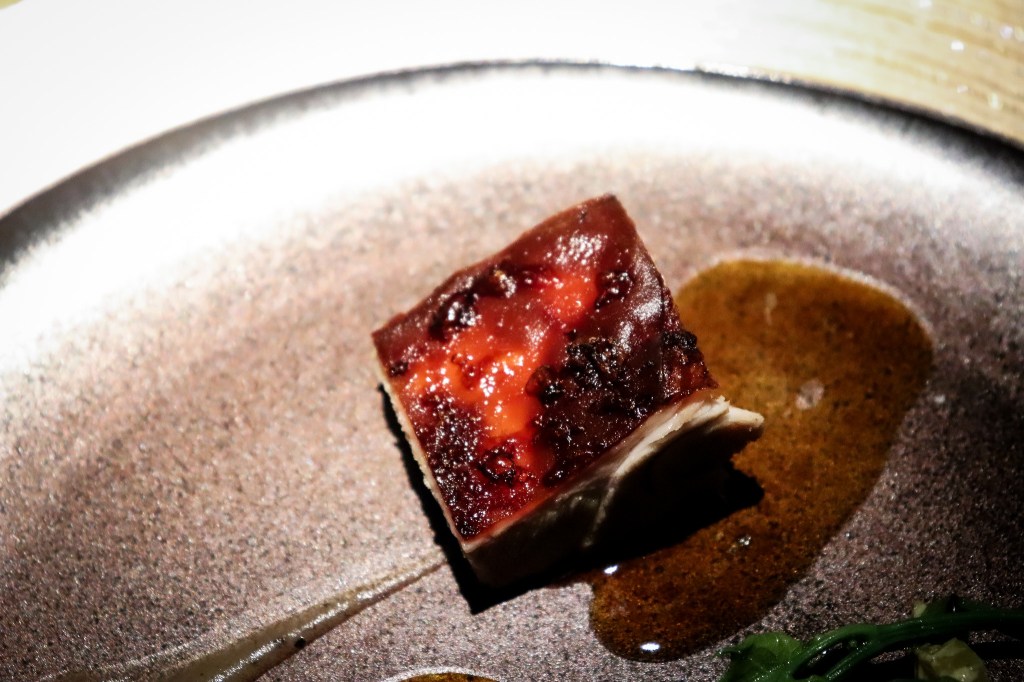 服務人員隨後端上了今天第二道菜是「鰹魚、煙燻茄泥、土佐醋」(Bonito , Baba ganoush, Bonito vinegar),這節奏還算精準。