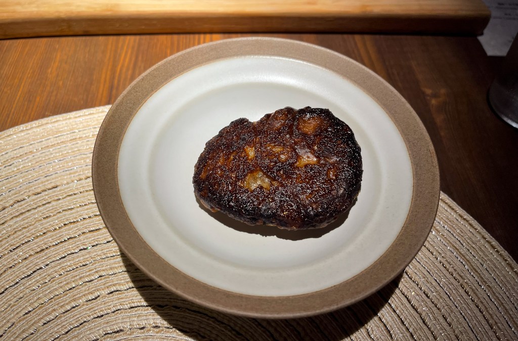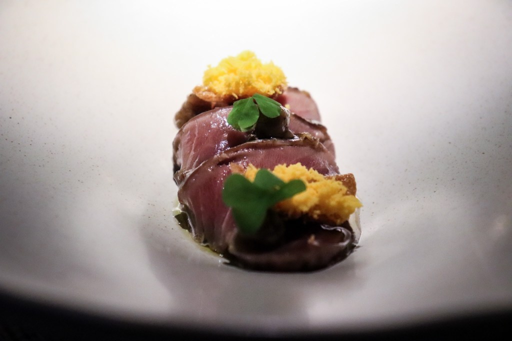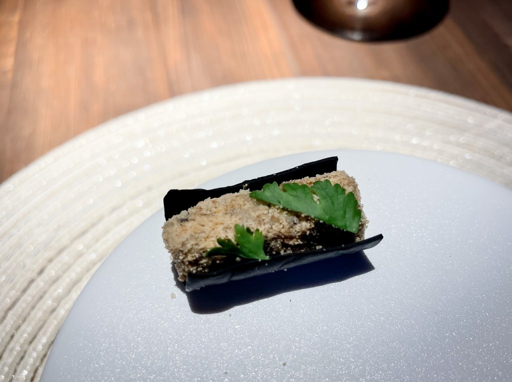 搭配茄泥又多了泥稠滋味,此外一起搭配吃下,不但有燻感,間於氣味,又一道我喜歡的魚肉美味。有趣的是,黃色的食材是米餅做成的,吃下時會有點crispy感,在魚肉滋味滑嫩後,在感官上多一點挑逗。