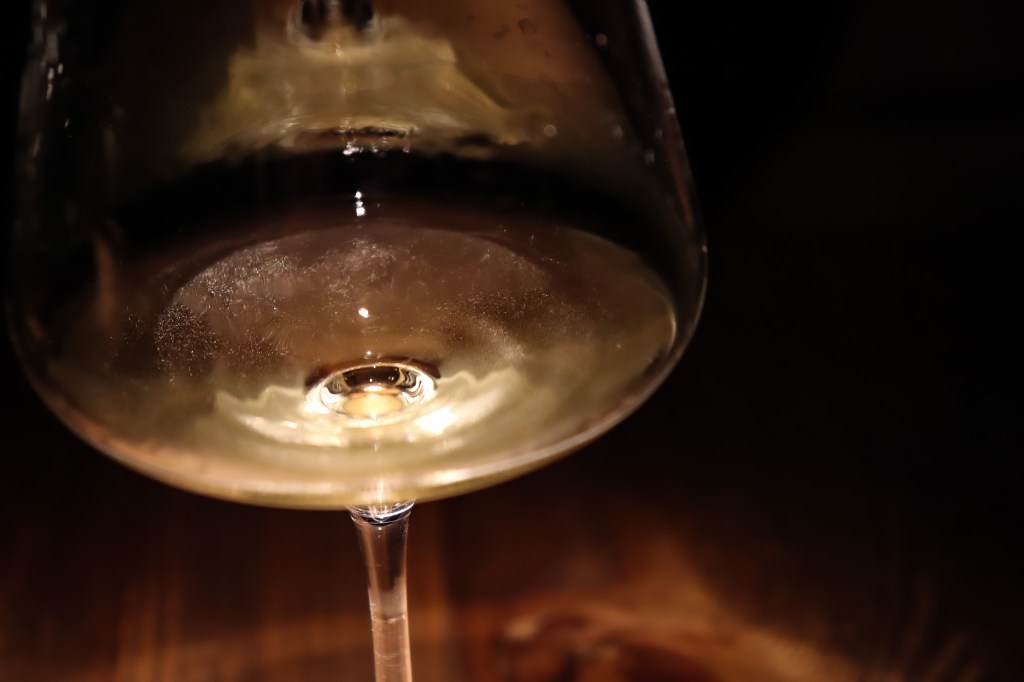 搖晃酒杯,酒腿逐漸流下,俐落優雅,落入酒面平靜,乾淨亮麗感。