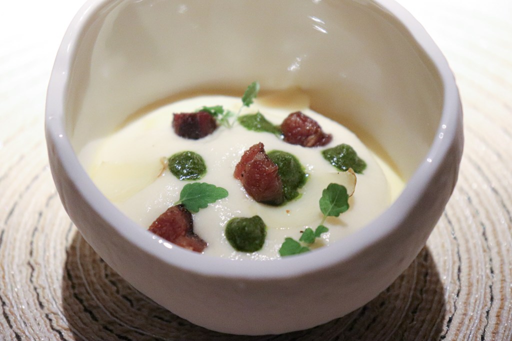 這道冰沙真迷人,尤其白玉苦瓜不是苦味和澀味,卻是意外的甜爽美味,整體搭配感到鳳梨糖片,在甜味上催化以及刺蔥泥的神來一筆的短薄滋味,這道又讓我覺得美好。