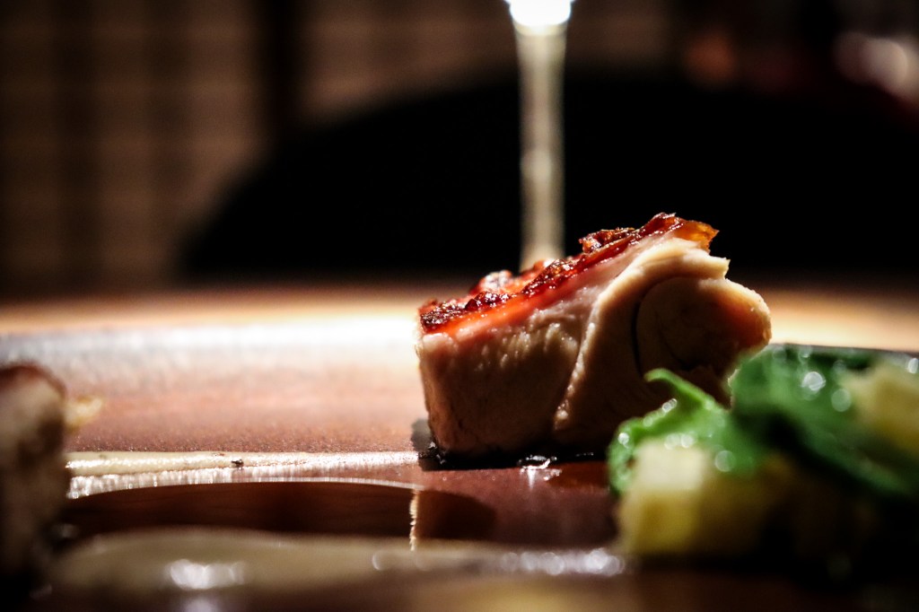 而讓我喜愛的是醬汁,對除了襯底用豬肉燉煮的褐色醬料,則帶著泥稠的鹹甜豬汁的感受外,另一個更有微甜以及馬告辛香料味的蘋果泥,當乳豬肉搭配這些醬汁,表現的整體味道又不一樣,反而更迷人。