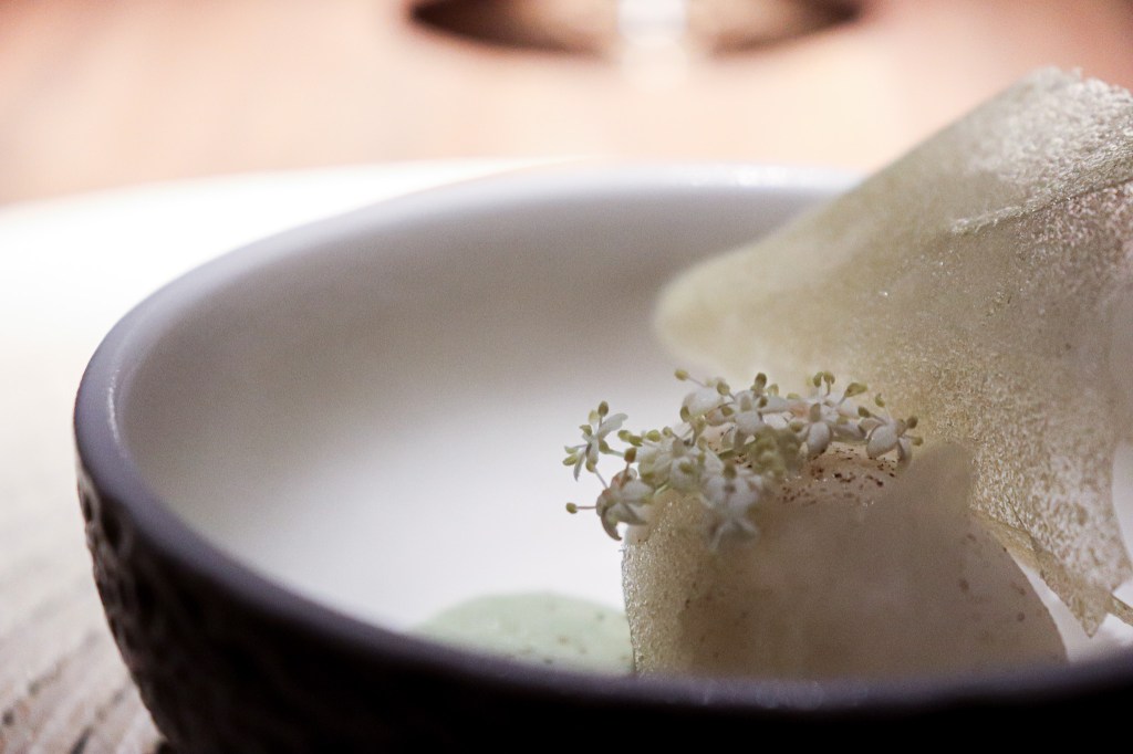 接著是第一道甜點,這道甜點是冰沙,內容物也相當豐富,有鳳梨糖片,然後用白玉苦瓜製作的甜點冰沙,搭配襯底的刺蔥泥以及刺蔥粉,再用接骨木花作為Garnish 。