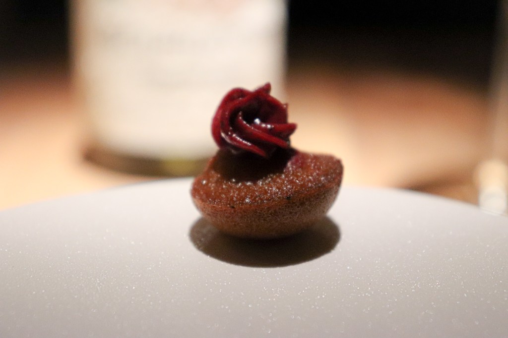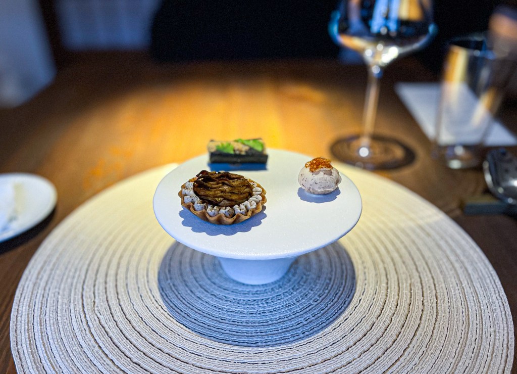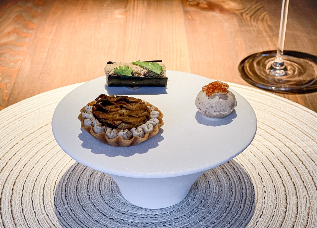 開胃小點心三道菜,第一款是花蓮芋頭的開胃小點,咬下爆漿,瞬間有點小淘氣感,略感受芋泥滋味,味道不算重,有達到小驚奇的任務。