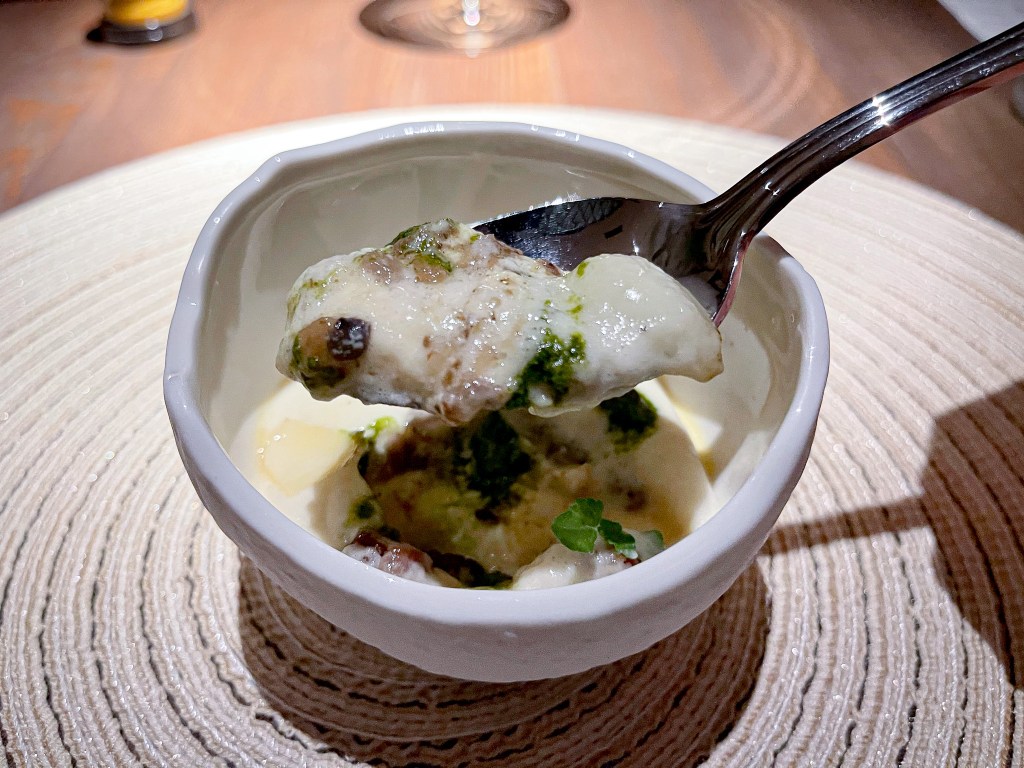 這蒸蛋真不錯,有著綿密蛋稠香氣,上層點綴著山當歸、製作的鹹中帶甜感的鹹豬肉、香蜂草、百合根,埋在蒸蛋下是炒蘑菇。